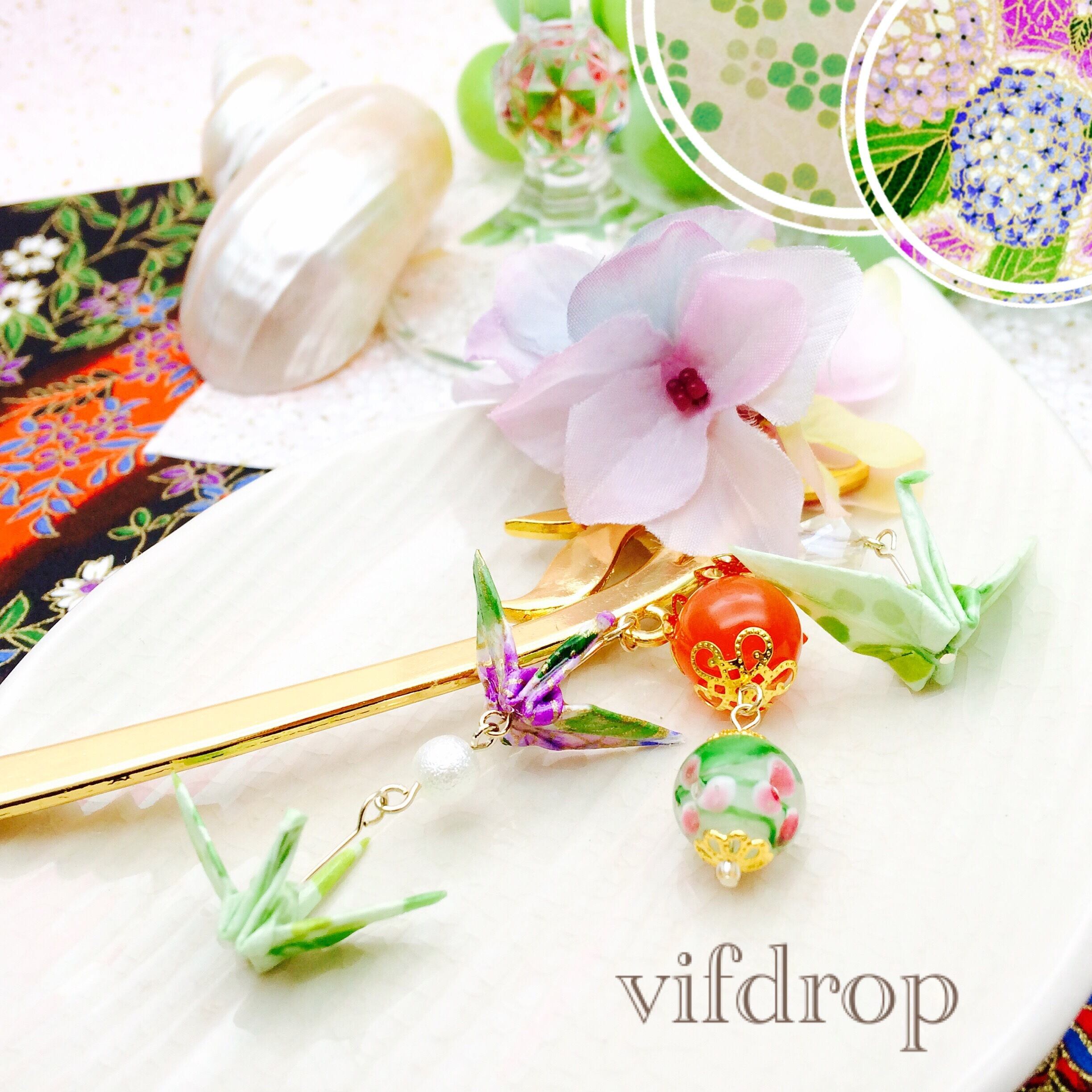 爽やかな色彩の紫陽花とトンボ玉が目を惹く✿3つの折り鶴の初夏の簪.:*