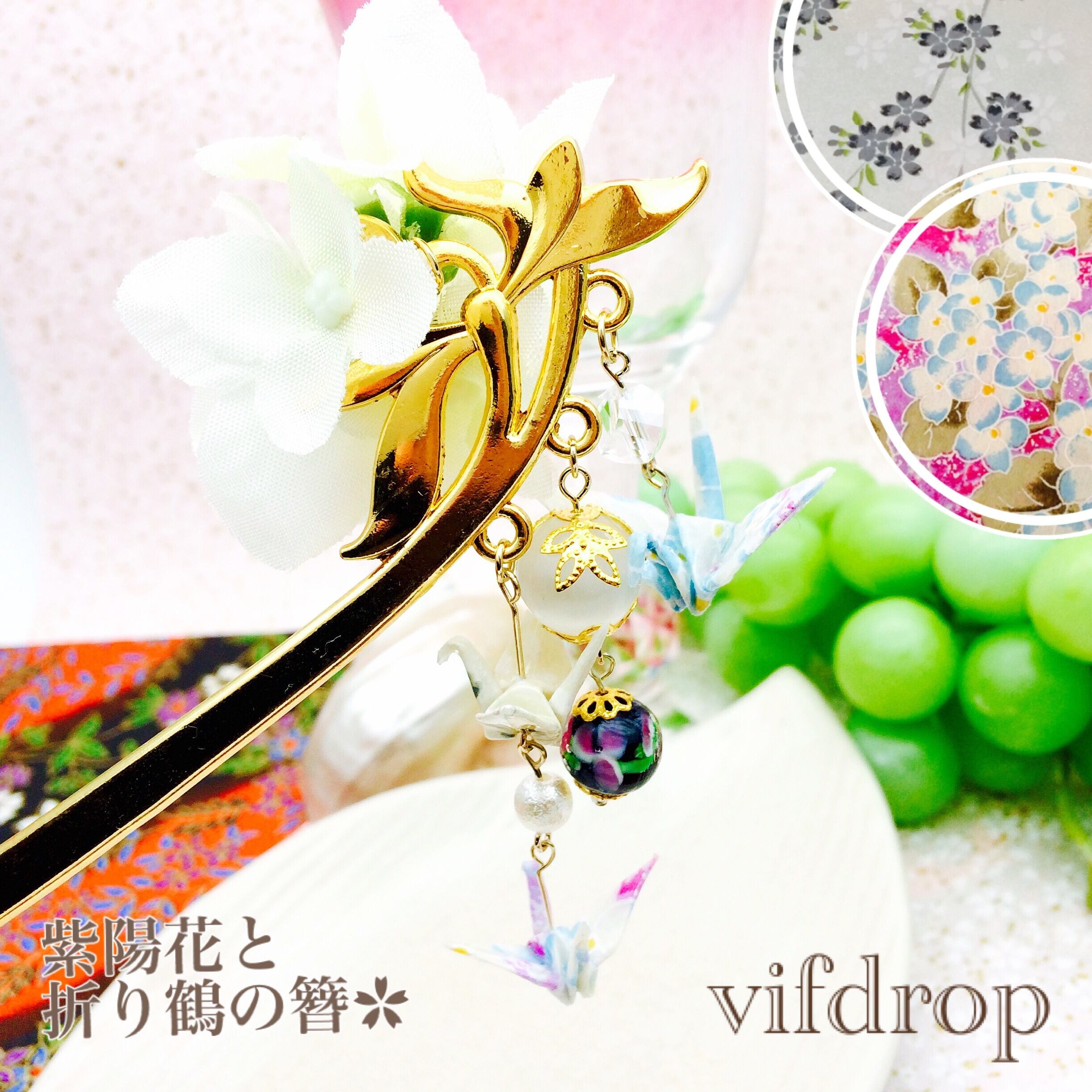 白【紫陽花柄・パールラメホワイト桜柄】折り鶴と紫陽花・トンボ玉の夏色簪