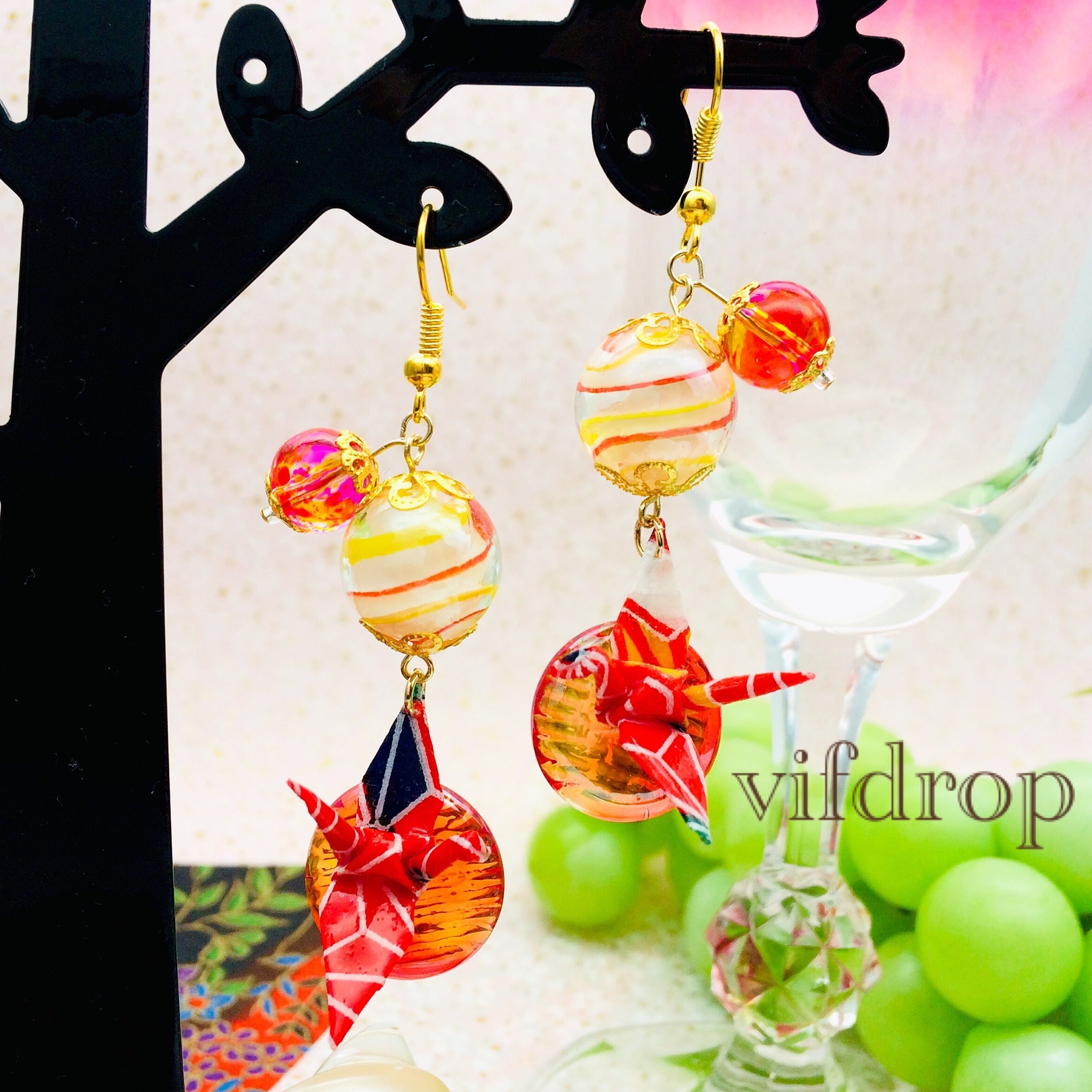 ノスタルジーでレトロ感が漂う和風個性派ピアス✿昔ながらのおはじきビー玉と折り鶴の、夏にぴったりの艶やかピアスです。