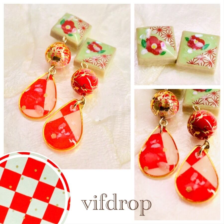 友禅和紙【赤白 モダン格子柄】雫&麻の葉椿柄タイルの和ピアス