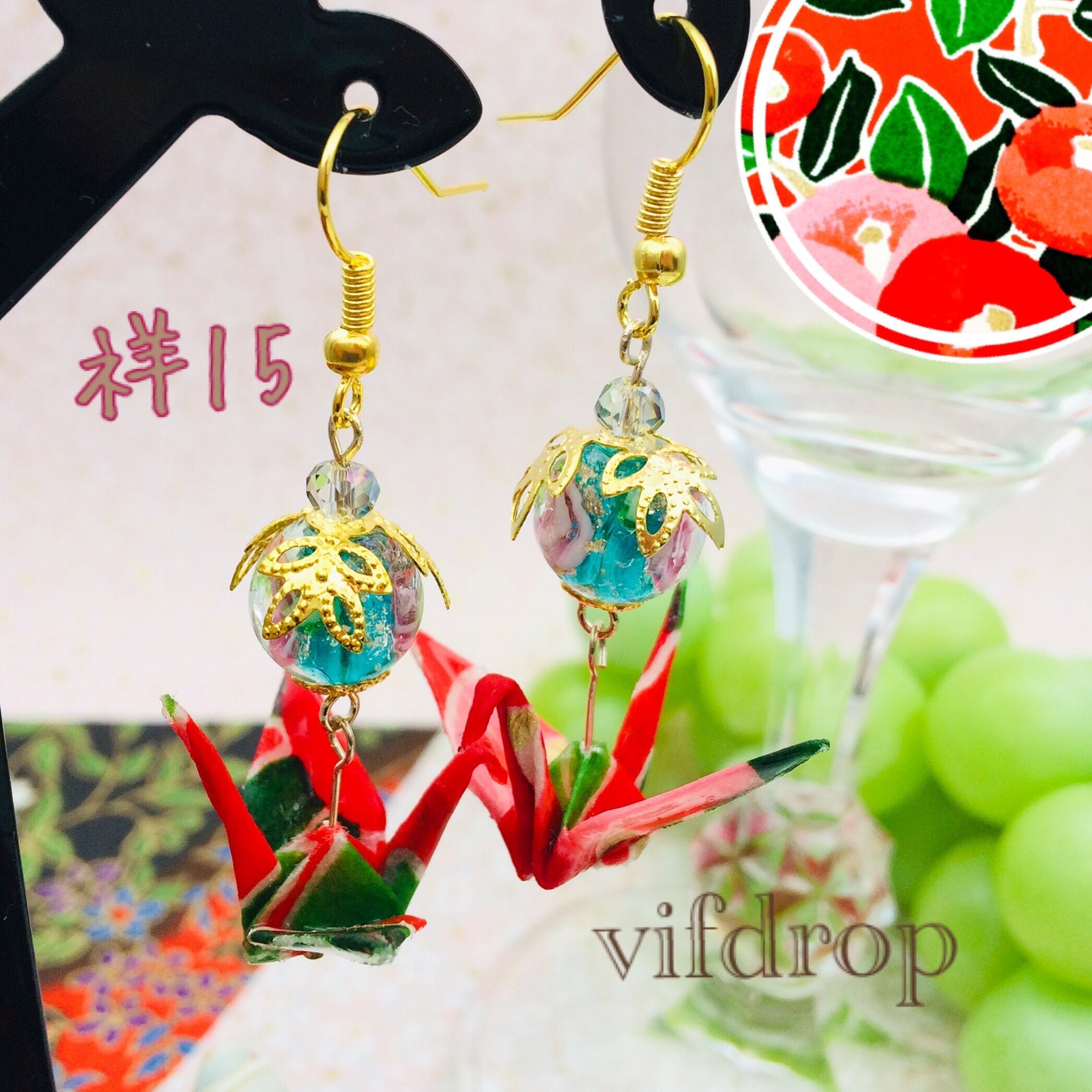 友禅和紙 祥15【緑地 赤桃椿柄】折り鶴と緑トンボ玉の和ピアス